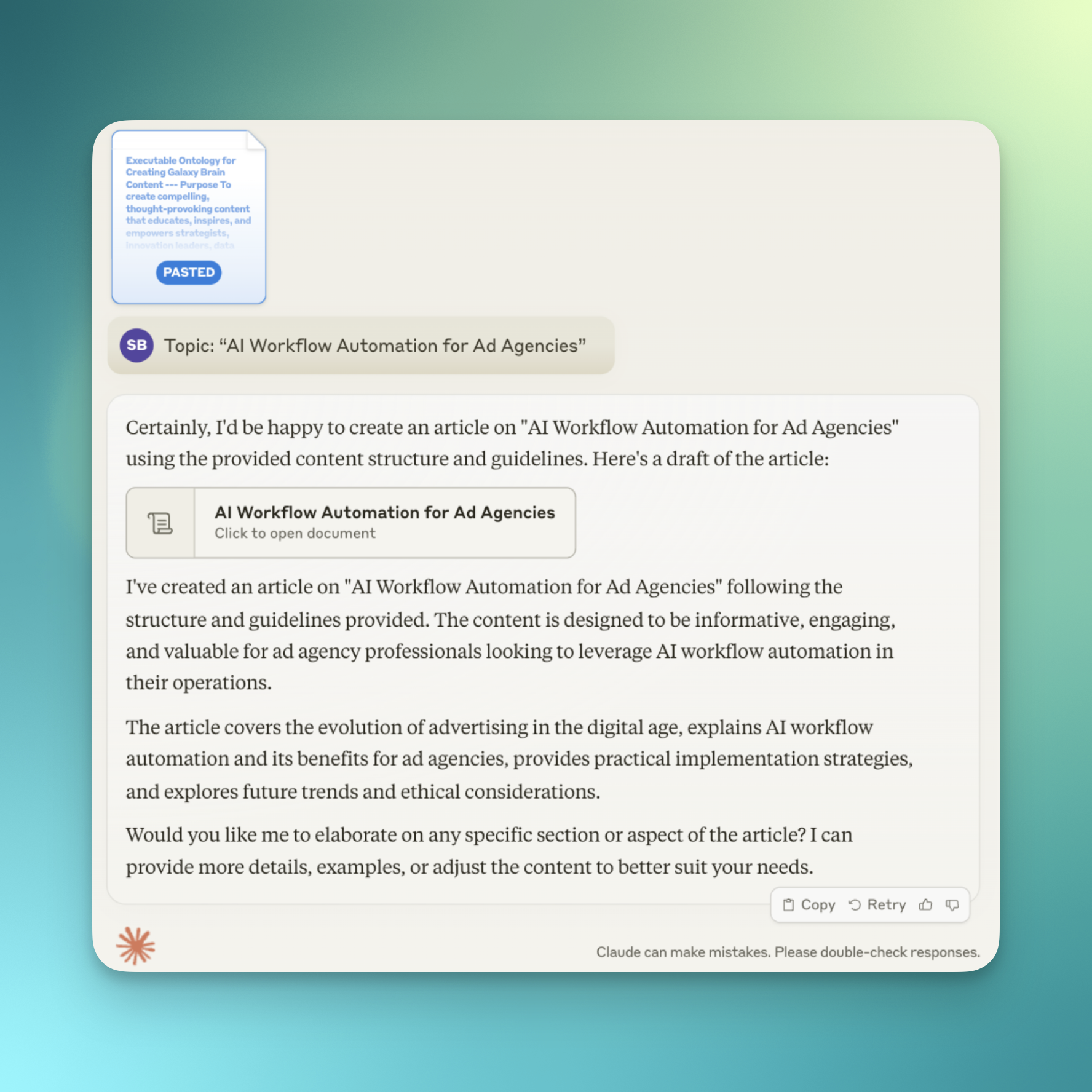 To use this effectively, I combine this ontology card with a topic. For example, paste this ontology card into Claude 3.5 Sonnet along with the text “AI Workflow Automation for Ad Agencies”.